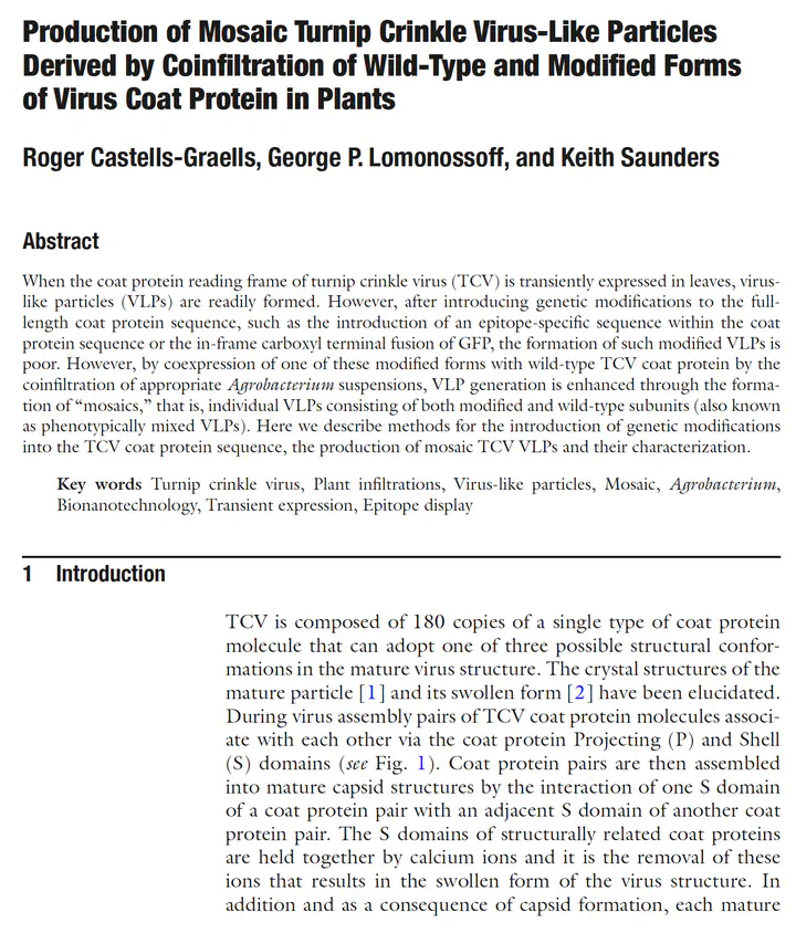When the coat protein reading frame of turnip crinkle virus (TCV) is transiently expressed in leaves, virus-like particles (VLPs) are readily formed. However, after introducing genetic modifications to the full-length coat protein sequence, such as the introduction of an epitope-specific sequence within the coat protein sequence or the in-frame carboxyl terminal fusion of GFP, the formation of such modified VLPs is poor. However, by coexpression of one of these modified forms with wild-type TCV coat protein by the coinfiltration of appropriate Agrobacterium suspensions, VLP generation is enhanced through the formation of ‘‘mosaics’’, that is, individual VLPs consisting of both modified and wild-type subunits (also known as phenotypically mixed VLPs). Here we describe methods for the introduction of genetic modifications into the TCV coat protein sequence, the production of mosaic TCV VLPs and their characterization.