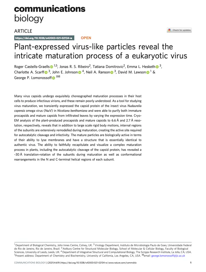 Many virus capsids undergo exquisitely choreographed maturation processes in their host cells to produce infectious virions, and these remain poorly understood. As a tool for studying virus maturation, we transiently expressed the capsid protein of the insect virus Nudaurelia capensis omega virus (NωV) in Nicotiana benthamiana and were able to purify both immature procapsids and mature capsids from infiltrated leaves by varying the expression time. Cryo-EM analysis of the plant-produced procapsids and mature capsids to 6.6 Å and 2.7 Å resolution, respectively, reveals that in addition to large scale rigid body motions, internal regions of the subunits are extensively remodelled during maturation, creating the active site required for autocatalytic cleavage and infectivity. The mature particles are biologically active in terms of their ability to lyse membranes and have a structure that is essentially identical to authentic virus. The ability to faithfully recapitulate and visualize a complex maturation process in plants, including the autocatalytic cleavage of the capsid protein, has revealed a ~30 Å translation-rotation of the subunits during maturation as well as conformational rearrangements in the N and C-terminal helical regions of each subunit.