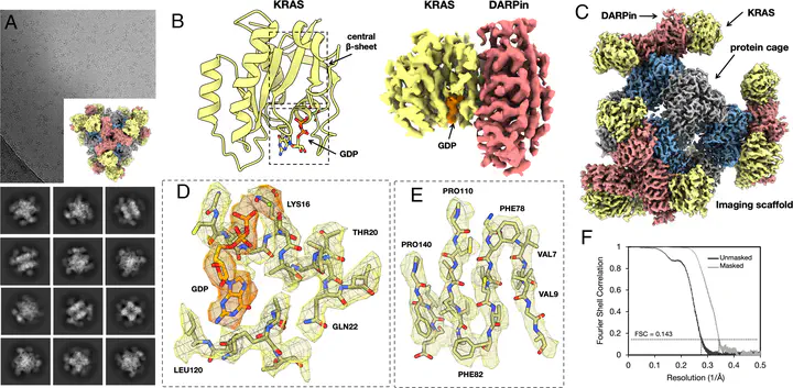 Cryoelectron microscopy (Cryo-EM) has enabled structural determination of proteins larger than about 50 kDa, including many intractable by any other method, but it has largely failed for smaller proteins. Here, we obtain structures of small proteins by binding them to a rigid molecular scaffold based on a designed protein cage, revealing atomic details at resolutions reaching 2.9 Å. We apply this system to the key cancer signaling protein KRAS (19 kDa in size), obtaining four structures of oncogenic mutational variants by cryo-EM. Importantly, a structure for the key G12C mutant bound to an inhibitor drug (AMG510) reveals significant conformational differences compared to prior data in the crystalline state. The findings highlight the promise of cryo-EM scaffolds for advancing the design of drug molecules against small therapeutic protein targets in cancer and other human diseases.