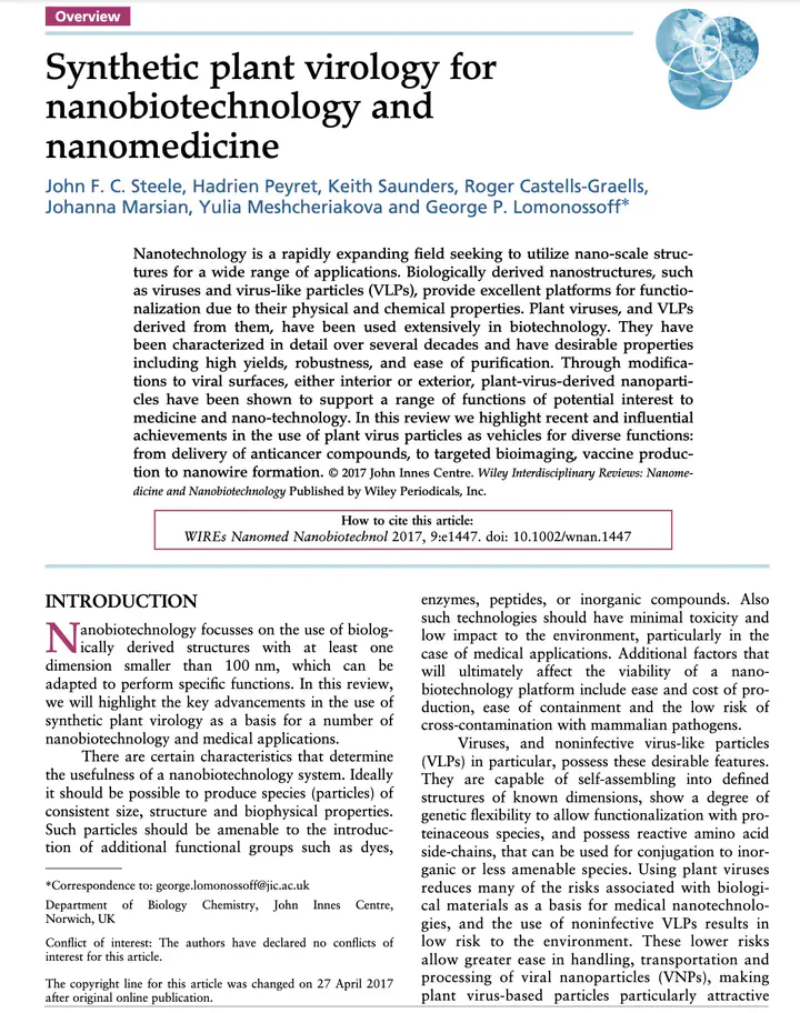 Nanotechnology is a rapidly expanding field seeking to utilize nano-scale structures for a wide range of applications. Biologically derived nanostructures, such as viruses and virus-like particles (VLPs), provide excellent platforms for functionalization due to their physical and chemical properties. Plant viruses, and VLPs derived from them, have been used extensively in biotechnology. They have been characterized in detail over several decades and have desirable properties including high yields, robustness, and ease of purification. Through modifications to viral surfaces, either interior or exterior, plant-virus-derived nanoparticles have been shown to support a range of functions of potential interest to medicine and nano-technology. In this review we highlight recent and influential achievements in the use of plant virus particles as vehicles for diverse functions - from delivery of anticancer compounds, to targeted bioimaging, vaccine production to nanowire formation.